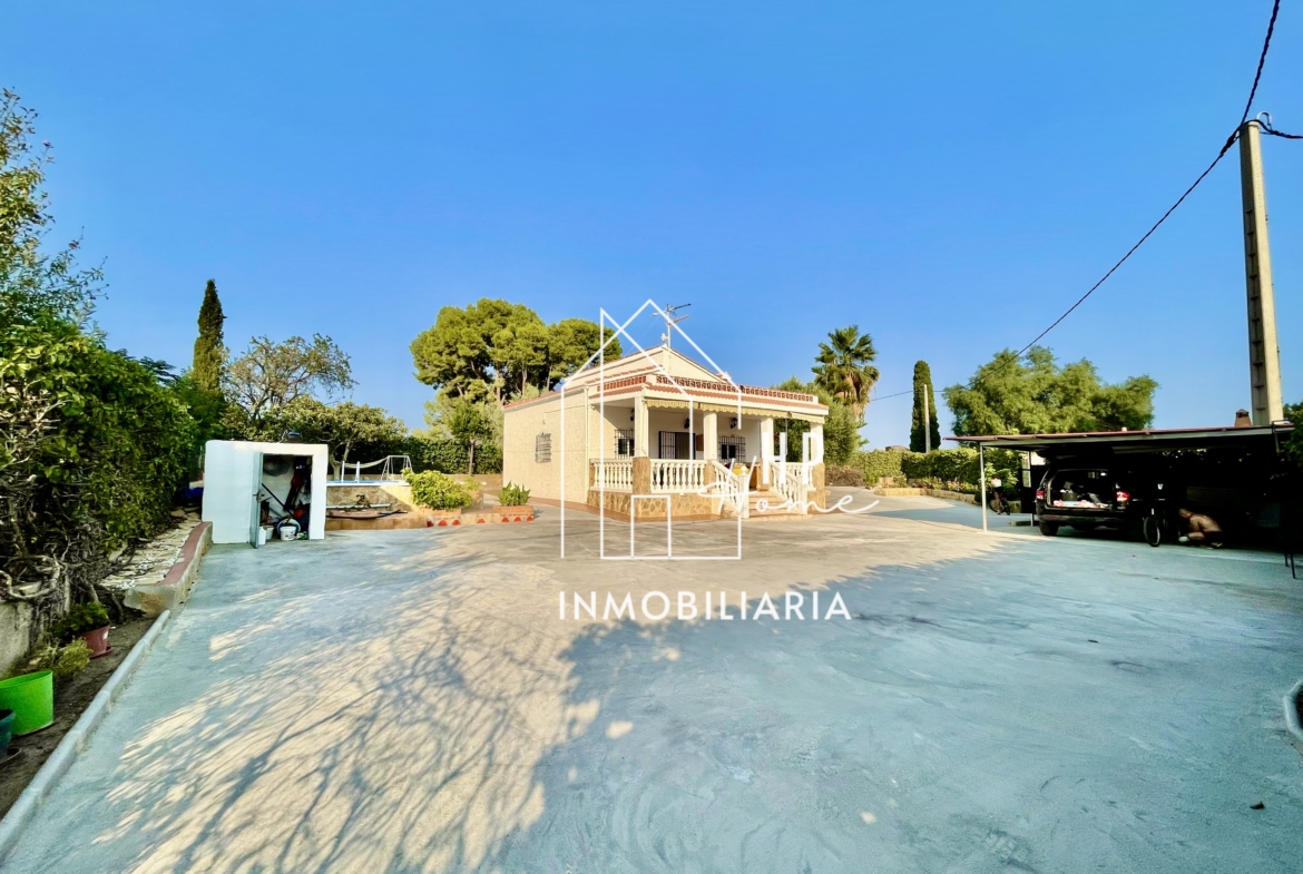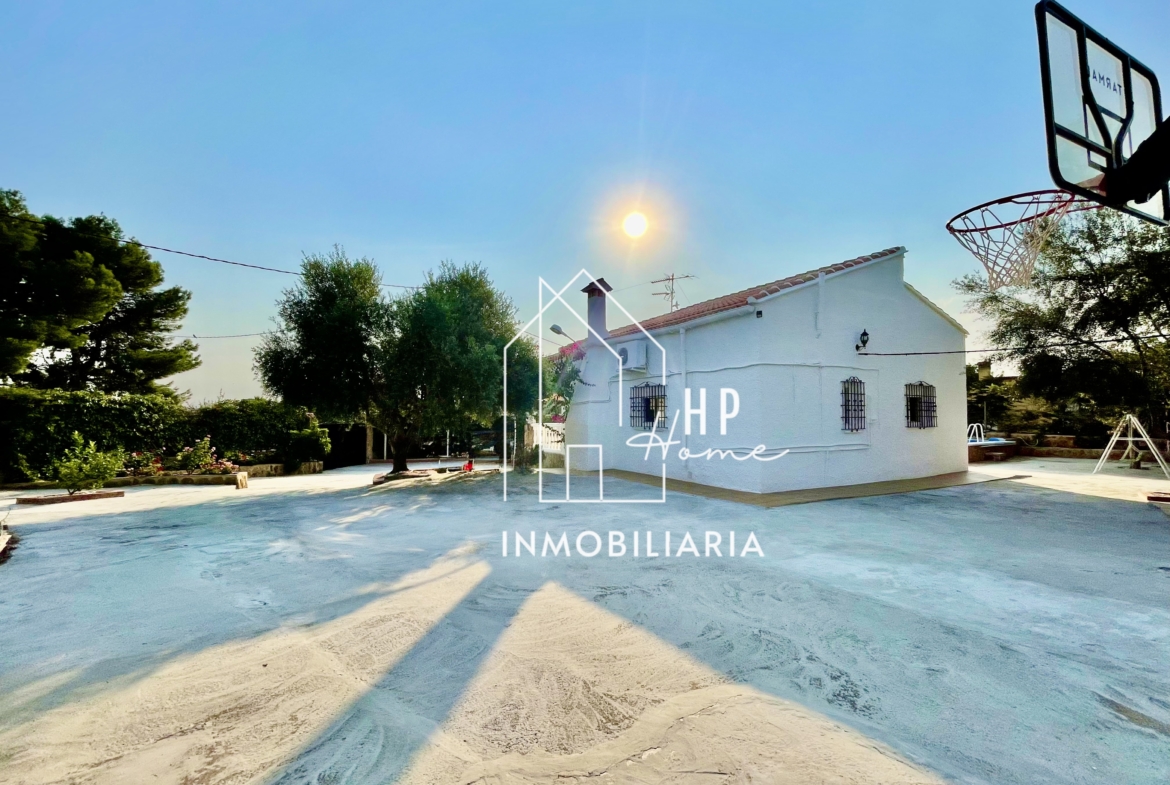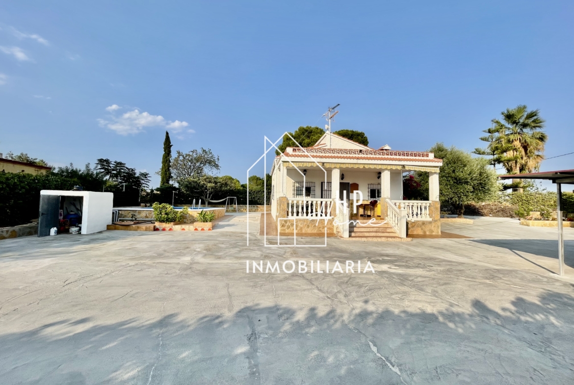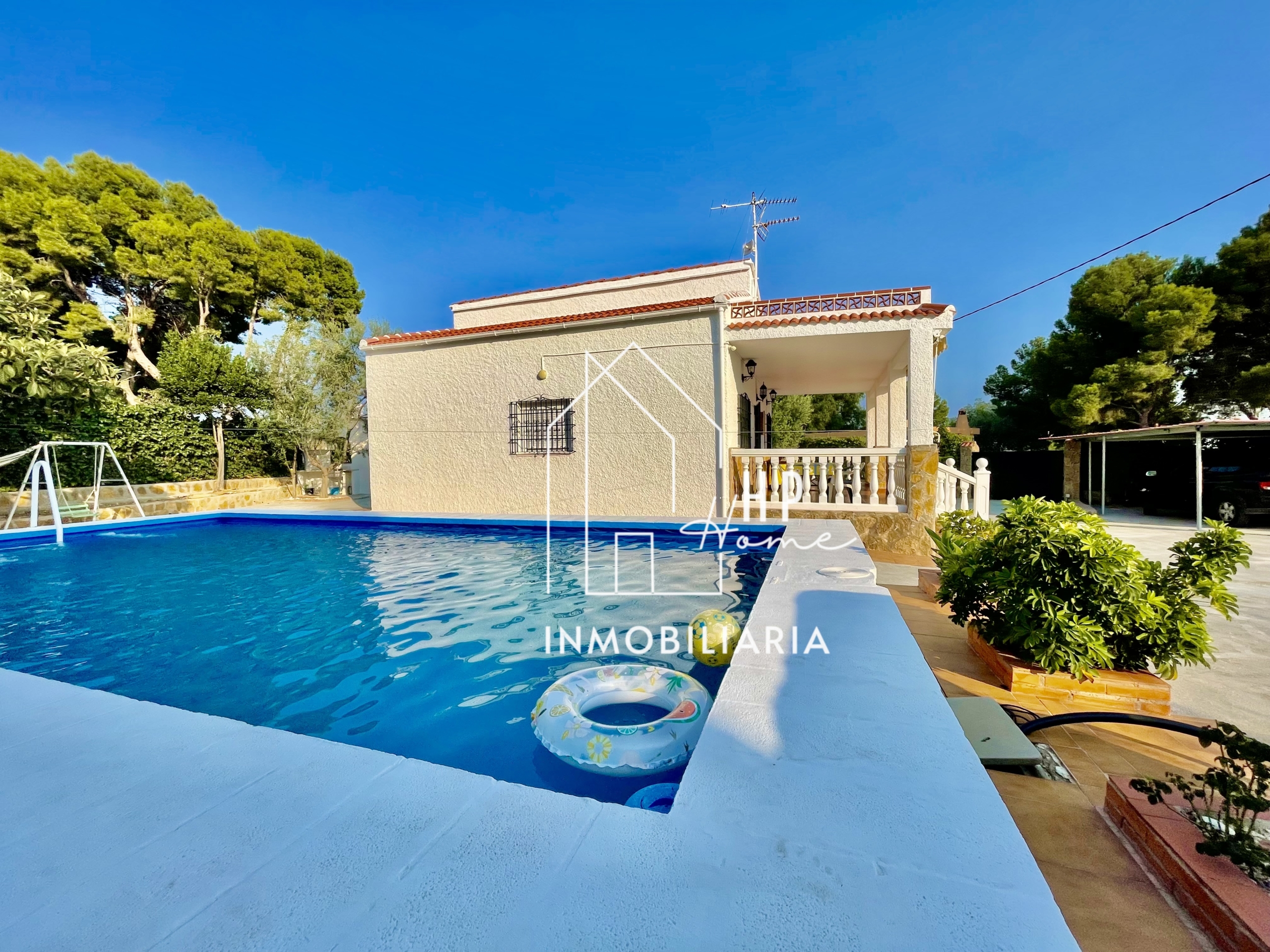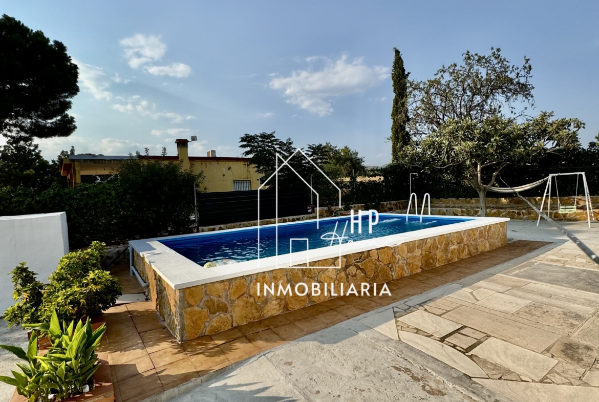 En el exterior tenemos una piscina con depuradora nueva de este año, un paellero perfecto con almacenaje y una zona techada para guardar nuestros vehículos, pasando a la zona de jardín nos encontramos con una zona muy cómoda y bonita para disfrutar de unas tardes y noches con nuestros familiares y amigos,